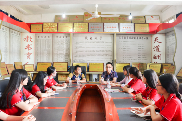 杨校长带领院党委书记及指导老师一行人来到寄宿制学校会议室,就本次“三下乡”活动开展座谈会议。队长卫思阳汇报了实践队这7天以来的各项工作开展情况。郭和才高度赞扬队员们都能在其位尽其职,为实践活动的开展贡献了自己的力量。同时要求队长要根据当地实践需要对原活动方案不断做出调整与改进,要让实践活动有效进行。并对新店寄宿制学校能提供一个平台给“伴我同行”实践队队员们锻炼自我的机会表示衷心的感谢。最后,郭和才希望杨校长能够在下一年与基地学校继续共建社会实践基地单位,协手立德育人,共同探讨教育教学问题。
