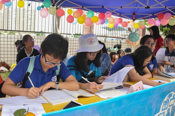在观众席上的大本营中,审稿组成员们也在埋头苦干。他们主要负责筛选加油稿和撰写加油稿并送至主席台广播处来为信息院加油。田径场上一声声为信息学院加油的声音,便是他们努力的成果。