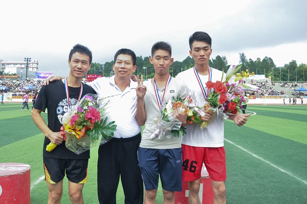 由15级计算机科学与技术(师范)叶强生,15级电气工程及其自动化1班冯柏荣,17级电气工程及其自动化2班邓奇乐,17级软件工程2班夏威俊组成的团队获得男子普通组4*100米接力赛冠军。来自校田径队且有接力比赛经验的叶强生履行队长职责,帮助队友进步,根据各自的优点与实力组织棒次,比如擅长弯道跑的冯柏荣担任第三棒,而爆发力强的叶强生负责第四棒。“我们决心要拿冠军”,在最后赛段,叶强生赶超原先领先于自己的对手。15级与17级队员于一周前才认识彼此,但他们在短短一周内充分利用午休与晚上时间,注重训练质量,总结反思,相互磨合,辛勤付出,使得“我们除了默契,还有信任。我们不看后面,也可以往后伸手接棒”成为可能。