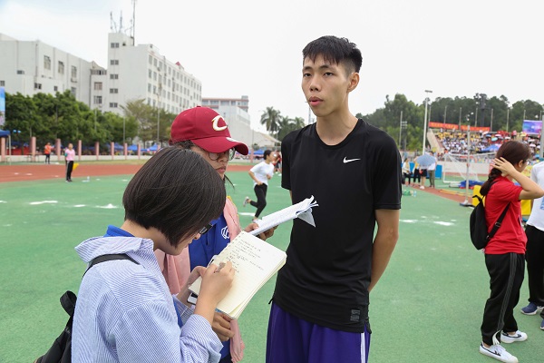 与校运会第一天跳高时的紧张相比,邓梓明当天则显得淡定从容很多。当被问到跳高和跳远哪个准备得比较多时,邓梓明说跳高是他的主项,自然是跳高准备得比较多。“状态对于一个运动员来说真的是很重要的,能不能在赛场上稳健发挥主要还是看心态”,他再次强调了心理素质的重要性,同时,他也希望同学们多多努力,取得更好的成绩。