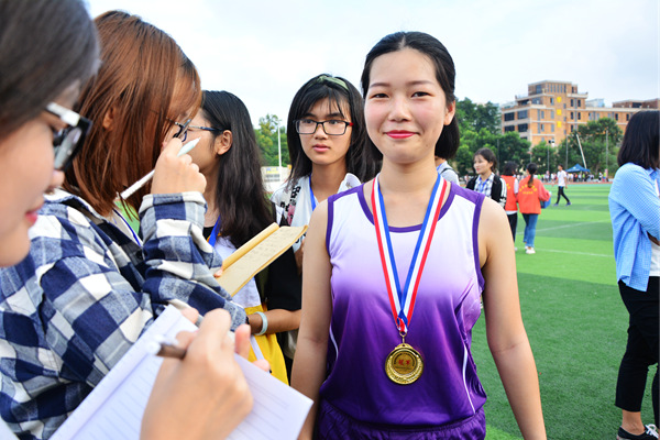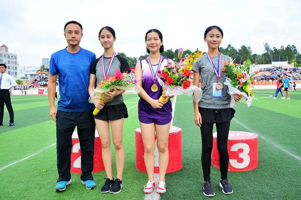 最终,来自音舞学院15级音本1班的陈贝安凭着20.57秒的成绩夺冠,法政学院的杨莹莹和伍婉倩分别以21.59和21.68的优秀成绩位列亚军和季军。赛后采访陈贝安了解到,对于赢得这次比赛的冠军,她表示十分的激动和兴奋,这将是她大学里参加的最后一次运动会了,终于完成了拿冠军的目标,努力没有白费。