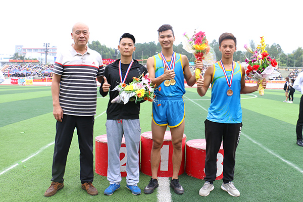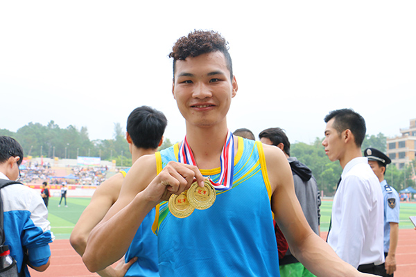 黄振东是基础教育学院15级体育教育的一名学生,今年是他第二次参加校运会,去年“黄振东”这个名字还少有人知,今年有人听到此名字已会感叹一番了。“检录的时候,叫到我的名字,旁边的人有点惊讶地说‘你就是黄振东啊’,让我心里怕怕的……”