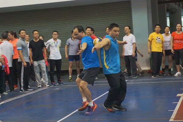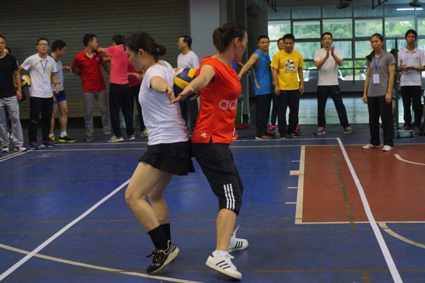 “要保持上肢不动”“步伐要一致”“你看他们两个的步频都不一样”。赛前,体育馆内回响着教职工运动员们关于如何让球稳稳地夹在两个人的背之间的讨论声以及教职工们的欢乐的笑声,现场气氛热闹非凡。