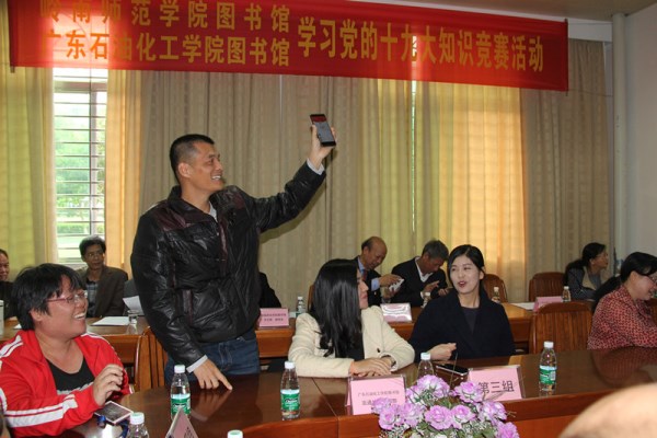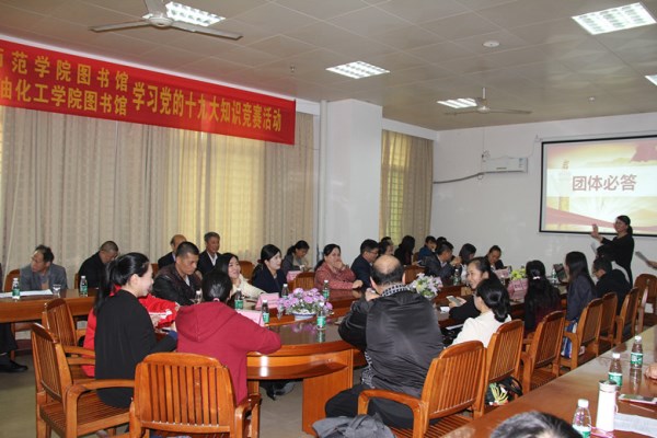 12月13日上午,我校图书馆党总支书记吴进带领35名党员前往茂名广东石油化工学院开展了一次特别的“党日活动,共同学习贯彻党的十九大精神知识。学校图书馆吴进书记、韦文辉副馆长、广油馆童汉清书记、李锦兰馆长、吕淑怡副馆长及两馆6个党支部共50多名党员参加了此次党的知识竞赛。