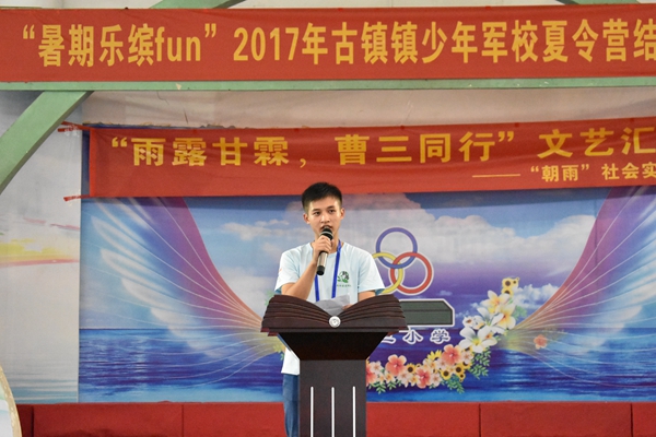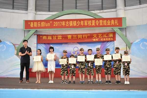三下乡社会实践活动转瞬即逝,7月21日下午,文传学院“朝雨”社会实践队迎来了“暑期乐缤fun”2017年古镇镇少年军校夏令营结业典礼暨“雨露甘霖,曹三同行”文艺汇演。