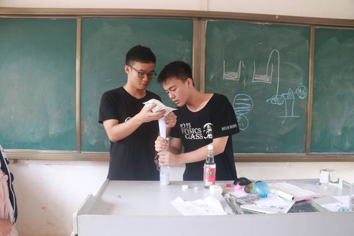 最后的水火箭的制作实验最为引人注目,得到了学生们的全心投入。由于制作水火箭的材料短缺,所以同学们只能与老师们一起做实验。先是由两位老师为学生做个示范以及讲解其中的操作要领,之后学生由老师的陪同下一起发射属于自己得水火箭。