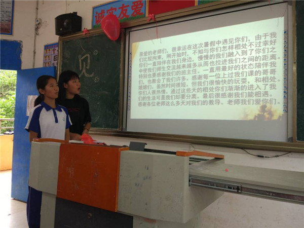 游戏过后,全体学生一起朗读了一段他们打算送给老师们的一段话,他们说他们在刚刚开始的时候,比较拘谨,随着时间的流逝,同学们与老师们渐渐熟络起来。同学们感谢一直陪伴着他们,为他们默默付出的班主任们,感谢给他们上过课的每一位老师们。