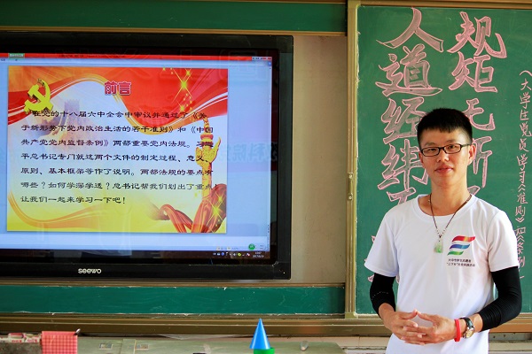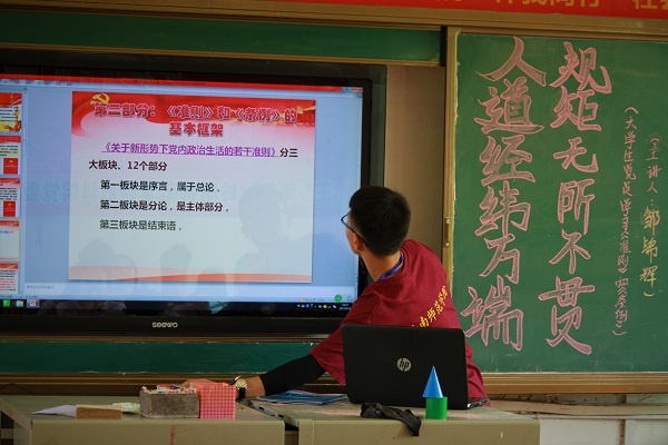 8月19日,“伴我同行”大学生党员社会实践队于湖南省邵阳市邵阳县小溪市乡文昌小学多媒体教室开展以“人道经纬万端,规矩无所不贯”为主题的党课培训。此次党课主讲人为教育科学学院教育系学生第四党支部副书记邹锦辉,“伴我同行”社会实践队全体成员参与了本次党课。