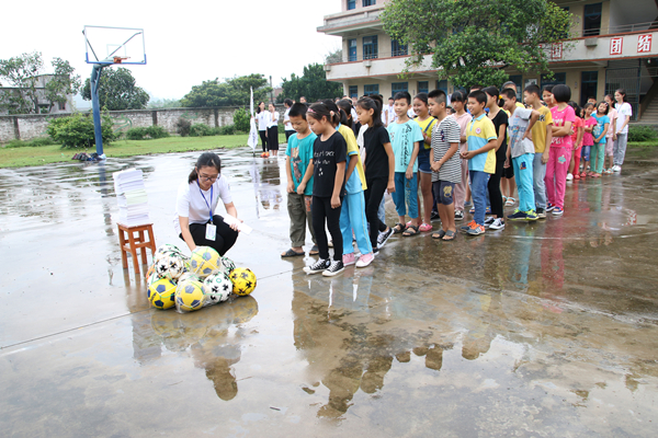 据了解,“校园足球下乡村”是岭南师范学院体育科学学院的三下乡特色活动之一。开展校园足球运动,但沙地小学缺乏相关体育用品,为此萌芽社会实践队向沙地小学捐赠了足球。图为队员们向学生分发足球。