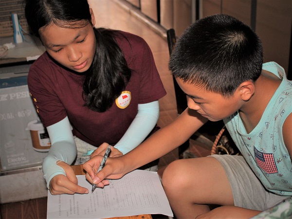 在那两个孩子填写问卷的期间,村里的好几个孩子听说了这事都跑到那两个孩子家中“看个究竟”,“很简单的,姐姐会给你们讲怎么填的,你们也来啊。”率先完成问卷的孩子招呼着其他孩子进屋,那些原本倚在门边看热闹的孩子犹豫着走了进来,队员们一个个详细地教他们填写问卷。