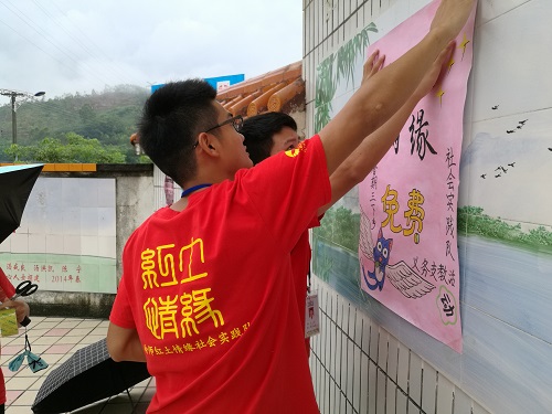 今天7月4号似乎没有往常的炎炎夏日,毒辣的太阳,而是凉风习习,下起了倾盆大雨。这给红土情缘社会实践队开展活动带来了诸多不便,但是为了能更好地向当地的村委村民宣传和介绍“红土情缘”社会实践队是来免费义务支教,传播“红土精神”。实践队队员还是毅然顶着雨拿着海报到校门口贴,一个搭手按住,一个递胶布,一个负责贴,配合默契,即使雨滴打在他们的脸上毫无在意,他们想为“红土”奉献的心战胜了漂泊大雨,意在表达我们“红土情缘”社会实践队心系这片土地,带着青春、梦想共同启航。我们通过免费义务支教,将先进带进农村,将知识带给学生,将福利带给村民,传播正能量,传承不怕吃苦、不求回报的“红土精神”,将服务基层精神传播,撒下希望的种子。
