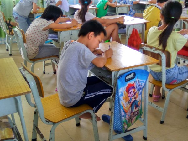 老师列举日常生活中随处可见的事物并让孩子们念出它们的英文名,以便巩固学生的单词基础和扩展他们的词汇量。还加入了“举手抢答”的模式,更是可以培养他们的胆量和气场。到默写了的时候,这个让大学生都会害怕的模式,学生们却战胜了,他们不急不慢,齐刷刷地写下了自己的答案,像是一个小小的“歪果仁”!