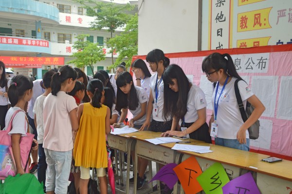 上午7时30分,位于中华小学大门口的报到点场面火爆。尽管天空飘着蒙蒙细雨,但学生和家长们的热情丝毫未受影响。虽然本次活动主要面向中华小学三、四年级的学生,但仍有二年级的家长带着孩子前来咨询。当得知我们的招生要求后,不少二年级的家长脸上露出了遗憾的神色。在队员们反复强调,每年暑假还有机会参与我校“三下乡”活动后,家长们眼中流露出欣喜的光彩。