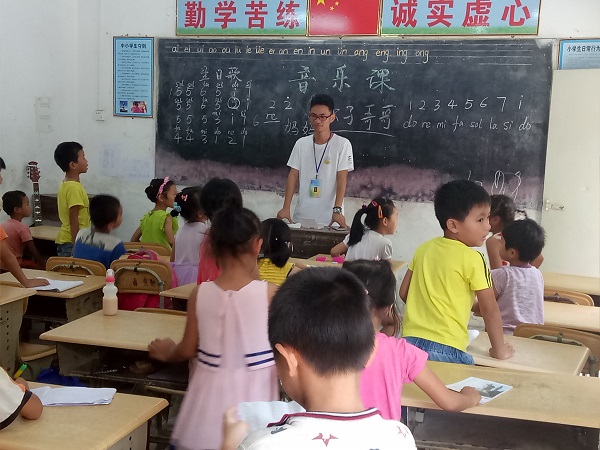 7月6日上午,因前一天晚上刚下了一场大雨,马劳地小学的校园里的空气异常清新。开班仪式结束后,前来上课的小朋友们心情还非常激动,可更令他们兴奋的是实践队的小老师们给他们准备了活泼有趣的特色课堂——音乐课。