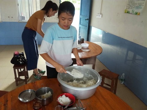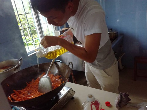而同样感到幸福的还有实践队后厨的四位掌厨人。红土实践队的每一位队员都有一次机会成为掌厨人。从买菜、摘菜、下米、炒菜、烧汤,虽然只有盐、油、酱油而没有其余的调味品。但他们依然用心清洗每一片菜叶,洒下每一颗盐,心中揣着队员们开心吃饭的念头。因为这想头,他们烹饪出的菜肴也更具光泽与色彩。为自己做饭会带来一份幸福,而为38人做饭则会带来38份幸福。当它们同时装在心间时即是一份满足与自豪。看着队员们大口大口地吃着自己做的饭,听着队员们肯定菜口感的赞美,别样的欣喜在心头冒出。他们也表示,这就是平淡中的幸福。