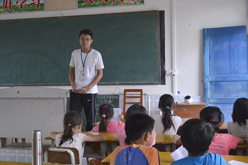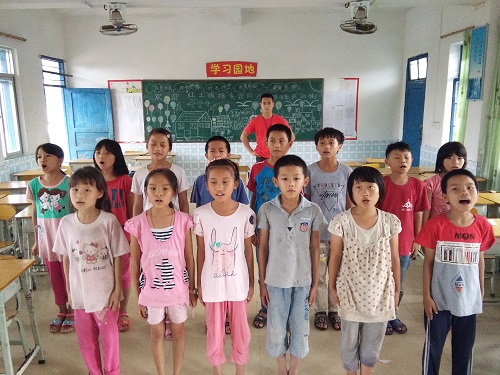 在课堂上,小老师给同学们准备了两首歌《奔跑》和《真的爱你》。首先,小老师给学生教第一首歌《奔跑》,因为这首歌节奏比较好掌握,比较活跃奔放,所以学生们很快就学会了唱歌的节奏,他们跟着旋律哼唱起来,只有个别歌词唱的好,咬字不清晰,但在小老师的耐心纠正下,学生很快就学会了带有节奏地唱整首歌。接着转入学习第二首歌《真的爱你》,由于当地的小孩都会讲粤语,说白话,所以学起来比较容易。但是有几个缺点就是个别字词带有口音,咬字错误,还有些快节奏的段子跟不上。就是这样,小老师花了很大的功夫来纠正他们的口音,然后一遍一遍地演唱,重点重复领唱快节奏的拍子还有重音和长音。慢慢地,学生们不气馁,坚持不懈,虚心听老师点评讲解。最后他们似乎找到了感觉,跟上了节奏,能唱出完整动听的歌曲。