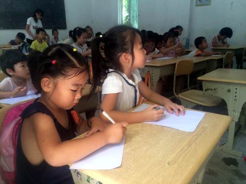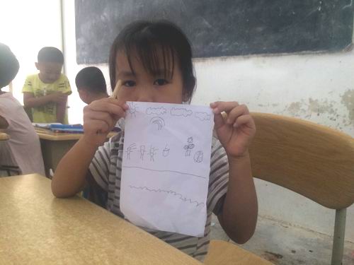 “七月流阳”实践队秉持着“将社会主义核心价值观融入课堂”的宗旨,为学生们安排了绘画课。绘画是孩子描绘他们眼中世界的方法,队员通过简笔画的教学,让孩子用自己的双眼认真打量世界,无形中也在引导着孩子们正确地认识世界,培养他们正确的价值观。