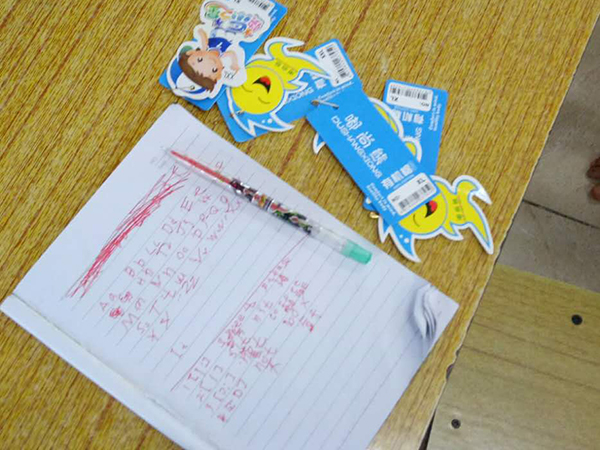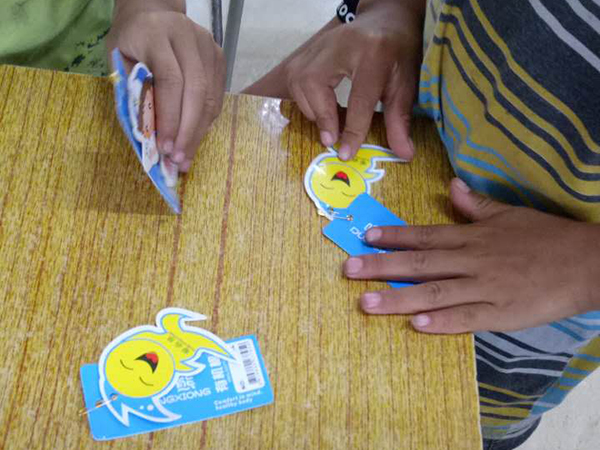 在手工制作课程结束后,笔者还发现了低年级的有一些学生拿着一些衣服标签能玩一天,并视若珍宝,谁也不给碰。小班主任玉媛问学生这是什么。学生们也只是羞涩地笑了一下后,就拿着衣服标签快速地跑了。