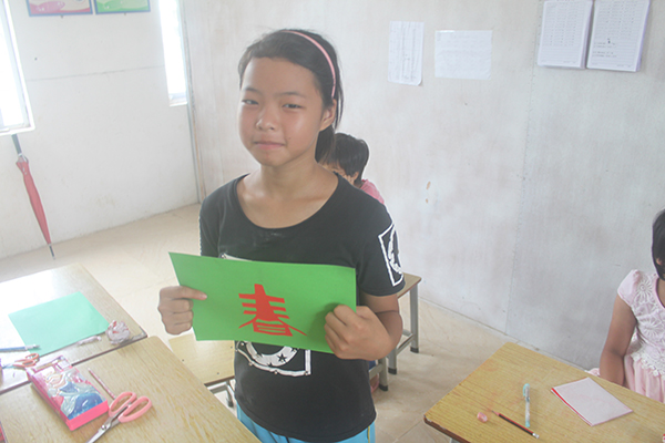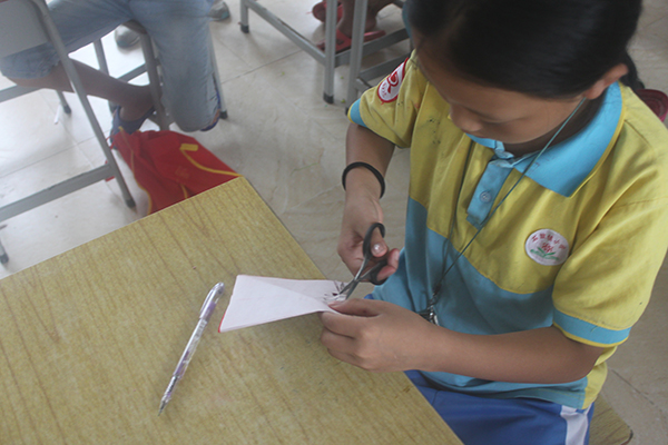 中年级的手工教学内容是中国民间传统艺术——剪纸。课堂上,孩子们各拿着一张大红色的纸和一把剪刀,但他们都皱着眉头。因为他们从未接触过剪纸,不知道怎样下手,怎样去剪出自己想要的图案。这并不奇怪,剪纸是一门讲究经验和手法的艺术,不是一两个小时就能学会的。不过,在老师的耐心辅导下,他们最终能够剪出大概的形状了。这对于刚学剪纸的人来说已经很不错了。再说,此次手工课重点并非是教会孩子们剪纸,而是让孩子们学会去动手剪纸,体会中国传统剪纸的独特魅力。