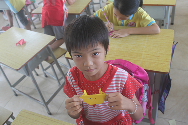 出于低年级的孩子们年龄较小、学习能力有限的考虑,教学人员打算教孩子们用彩色卡纸折小青蛙和小兔子。上课的信号发出后,教学人员就把彩色卡纸发给小朋友了,孩子们拿到卡纸都非常开心。发完卡纸后,教学人员就开始上课了。教学人员折一下卡纸,孩子们就跟着折一下,课堂的气氛非常的融洽。