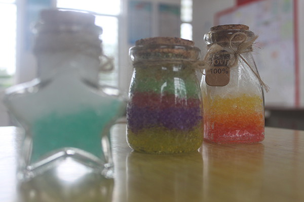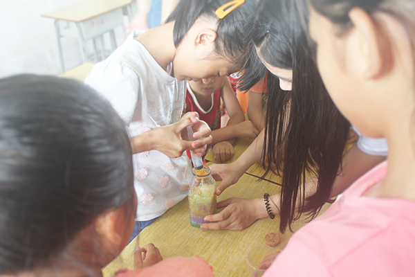 高年级的同学们一开始听到制作星光瓶,都热情高涨。不过开始制作没多久,现场就乱成了一锅粥,就如之前预料的一样,有几个比较叛逆的同学反抗老师的权威,扰乱课堂秩序。不过,在老师们的管教之下,课堂秩序又慢慢地恢复了。课堂秩序恢复后,高年级的同学们都一脸认真地制作着星光瓶,他们一边讨论着哪些颜色搭配起来好看,一边把彩色小珠子放进针筒里压碎,然后倒入透明玻璃瓶中。经过师生的共同努力,他们最终制作出了好看的星光瓶。同学们看着自己亲手制作的星光瓶,露出了自豪的笑容。