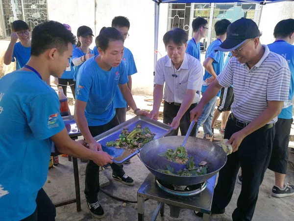 中午,林汉、吴万一行到达“希望家园”社会实践队实践基地——雷州市附城镇麻演小学,并与麻演小学郑敬亮校长、麻演村村委书记徐之谦、村志愿者郑进碧等人共同为麻演小学——“岭南师范学院大学生社会实践基地”揭牌。在队长林剑松的陪同下,林汉与吴万观看了实践队员们的生活起居环境。为积极鼓励队员们全身心投入到社会实践中去,林汉与吴万还亲自下厨,与同学们一起体验生活,赢得了实践队员们的热烈喝彩!