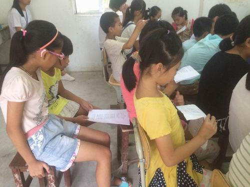 同学们正在认真看朗诵稿