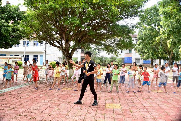 7月10日上午,“希望潮”社会实践队支教组在山内黄镜秋学校的操场上开展了一堂动感十足的健美操课。