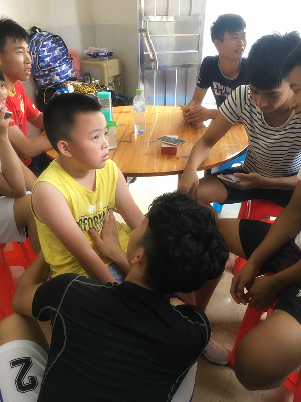 据了解,这个来自三年级(1)班的小男孩突然向老师反映手肘疼痛难忍。在校就读运动康复专业的后勤组组员陈英澎运用专业知识,对小男孩的手臂进行初步检查后建议联系家长将孩子带去正规医院做进一步检查。然而小男孩表示只是旧伤复发,并以沉默拒绝队员的提议,这让队员们感到为难。
