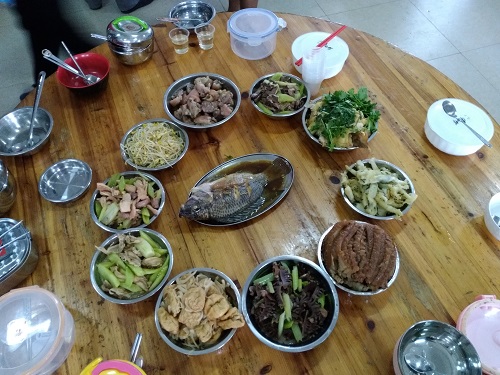 村民们分工合作与队员密切配合,三五两下,一道道令人垂涎三尺的菜式出现在席上,梅菜扣肉、白切鸡、青瓜炒肉、清蒸鱼……一顿充满关怀和谢意的丰盛饭菜就这样做好了!下课归来的队员们看到村民的到来后,感激之余并表示热烈欢迎。