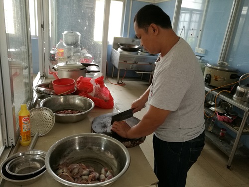 下午,只见一行人手提肩扛着丰富的食材前往厨房准备大显身手,想好好地犒劳尽心尽力的“红土”老师们,接下来,话不多说,村民们已经张罗着杀鸡的杀鸡、洗菜的洗菜、切肉的切肉了,看到他们无比闲熟的准备着一切,不禁地让人想起了家中的父母,他们也总是这般,拥有手法闲熟的刀工,手中的食材被粗细一致地切开,手提油瓶往锅里轻转一圈,油便像有了鲜活的生命般发出“滋滋”的声响。他们永远不用问盐的多少、米的用量,长期的生活经验,让他们心中自有一把明秤……村民的到来让队员们感受到了家中父母般的温暖!
