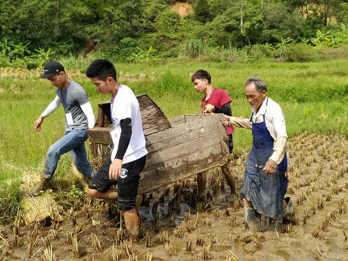 炎日当空,火辣辣的太阳照耀在“红土”共建组组员的脸上,但丝毫阻挡不了他们前进的步伐。来到目的地后,村委会巫书记带领着6名组员来到田地,男生和女生各分两队,分别在两块田地里割稻谷。女生那边比较轻松,她们割完稻谷后,农民阿姨拿来电动的打稻谷的机器帮忙打稻谷。而男生那边相对比较辛苦,他们用的是手动的机器打稻谷。他们满脸如雨下的汗珠,裤子也沾染了泥巴,脚趾甲也嵌满了泥土,他们也顾不上,一心一意只为帮助农民们干活。