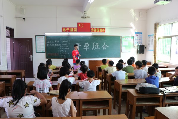 为了增进支教队员和当地小学生之间的交流和更好地推动教学工作的进行,岭南师范学院数计学院“心梦” 社会实践队于7月11日早上在湛江市吴川市黄坡镇官江小学举行了开学班会。