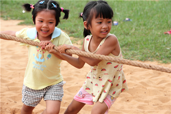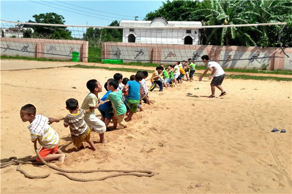 “加油,加油,加油……”老师们和学生们助威呐喊的声音响彻整个运动场。小老师们为了能够让学生们更加的团结友爱,有团队意识,增强体魄,在课堂上,专门开展了一场分为男男对抗、女女对抗和男女混合对抗三种类型的拔河比赛。学生们都对拔河比赛很感兴趣,兴高采烈地唱起了歌儿,在比赛前,小老师给学生们讲解拔河的动作要领之后,拔河比赛就正式拉开了序幕。看着每个学生都听从小老师的教导扎着马步咬紧牙关全力以赴,师生合力呐喊助威,比赛胜利的小朋友之间相互拍手欢呼庆祝,与小老师们分享胜利的喜悦,可以看出小朋友们对小老师的信任和依赖。学生相互之间密切配合,齐心协力拔河时,他们的笑脸充满了满满的幸福感和团结感。
