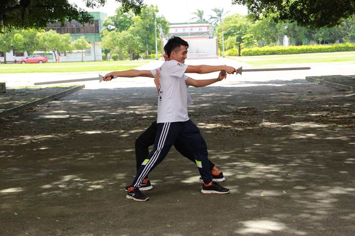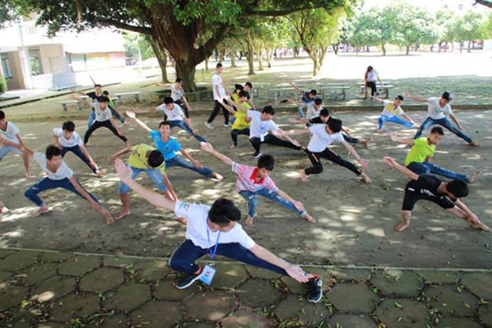 7月11日上午,榕树底下,暖阳普照。岭南师范学院外国语学院“萤火”社会实践队教学组的何嘉健老师、陈运锋老师为杨柑中学初二级全体男生带来了别样的第二课堂——剑术+歩拳套路。
