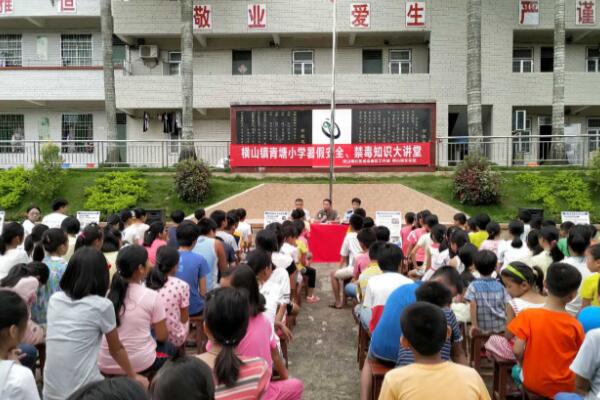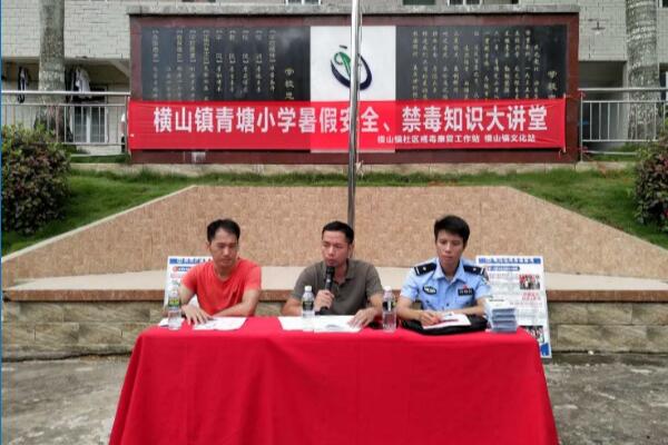 为了进一步加强我们青少年对毒品危害的认识,增强自我保护意识,营造良好的成长环境,普及毒品预防知识,进一步提高全民抵御毒品的能力和禁毒的意识。 7月14日下午,青塘小学的领导邀请廉江市横山镇社区戒毒社区康复管理站的工作人员来开一个以“暑假安全,禁毒知识”为主题的校园禁毒宣传教育讲座。出席本次讲座的人员有禁毒工作站的站长莫秋、派出所民警杨康军、李晓燕、在校师生以及“纸鸢”社会实践队的队员们。