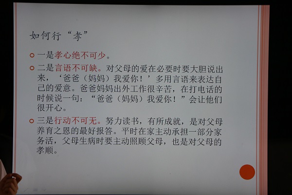 课堂上,老师特别强调了《三字经》中的孝心问题。老师借助了一系列的故事向学生们讲述了百行以孝为先的道理,还不忘提醒学生们父亲节、母亲节以及感恩节的时候要向父母表达自己的爱意。随后,老师就孝顺的问题,向学生们提问该怎么从实际行动上孝顺自己的父母。学生们都争抢这举手回答,课堂氛围很是热烈。