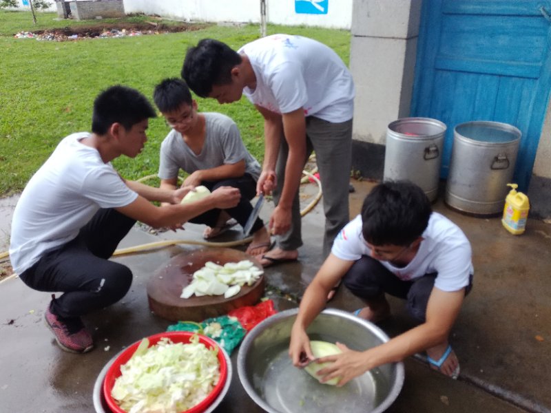 上午十点钟左右,后勤组照旧着手午饭准备工作,这时天气仍是十分晴朗,队员们丝毫预测不到任何要下雨的征兆。十点半过后,后勤组员已经生好火煮好水,准备下米进锅。然而,这时队员们看到了东边的天空有一大片乌云正在渐渐逼近,于是他们就把另一个还没生火的灶炉与大锅移入屋檐下,防止一会儿在炒菜过程中被大雨淋湿。煮饭的灶炉已经生好火,没有办法再移,队员们只能放米下锅,祈祷煮好饭之前不要下雨。天公不作美,在饭快要煮熟的时候,天就下起了大雨。眼看柴火就要被浇灭,队员们撑起了伞,站在灶前,遮住灶炉和大锅,进行了一次轰轰烈烈的“护饭行动”。在后勤组及其他队员们的努力下,饭最终被护住了,汤和菜也被顺利准备好。吃午饭时,每个队员脸上都架起了微笑的彩虹桥…