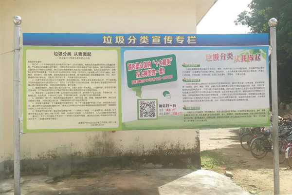 山内黄镜秋学校地处山内,四周群山环绕,环境优美,空气新鲜,风景宜人,却因垃圾处理问题而美中不足。“希望潮”社会实践队宣传组以敏锐的神经发现了这一问题,并以此作为了工作重点,将宣传组的板报制作的主题定义为垃圾分类处理。以此为基点,策划了垃圾分类宣传专栏及“垃圾不落地,校园更美丽”黑板报。