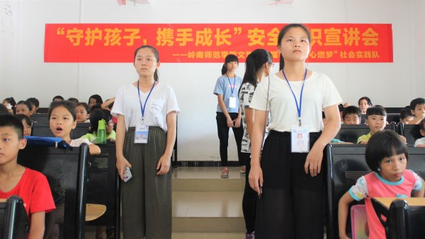 为了让湛江市吴川市博铺中心小学的学生更全面地了解安全知识,懂得在各种灾害面前更好地保护自己,2017年7月15日下午15:00,岭南师范学院“同心燃梦”社会实践队在实践基地博铺中心小学多媒体室召开了“守护孩子、携手成长”安全知识宣讲会。