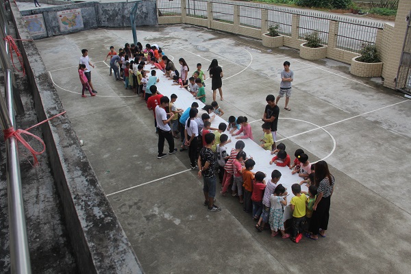 7月16日,岭南师范学院物理科学与技术学院“扬帆启航”社会实践队在茂名信宜新宝镇清水村的暑期三下乡活动即将落幕。为能让清水小学的孩子们留下美好的回忆,7月16日下午,“扬帆启航”社会实践队举行了“百米画廊”活动,所谓“百米画廊”,即是将很长的白布拉开,让孩子们在上面随意的图画或者写一些想对老师们说的话。
