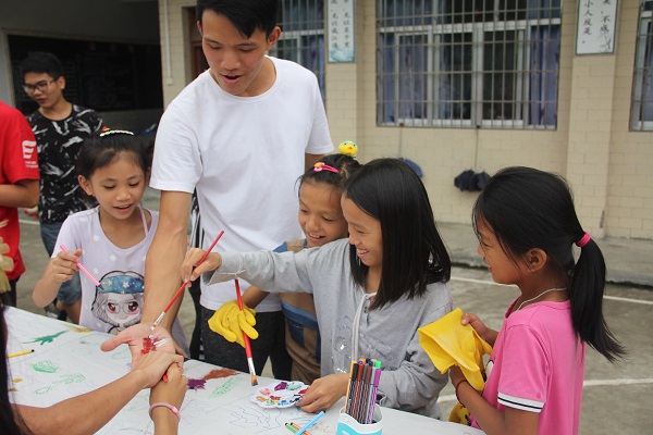 孩子们在旁边的桌子上,调好颜料,拿起画笔,前往放画布处,孩子们将画布围成了一圈开始作画。图案大大小小,各式各样。图案承载着孩子对老师们敬爱与情感。作画结束后,孩子们的手已经脏得无一净处,老师带着孩子们到厕所里把手洗干净,洗去了颜料,但留下了美好的回忆,这份美好的回忆将陪伴着孩子们的成长。十多天的支教,十多天的感情,十多天的回忆,孩子们用心画的画和写给老师的话,全都集中这张画布里。