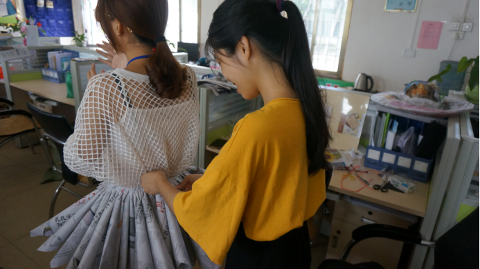 天尚未亮,李倩红和曾海霞早已醒来。她们加快脚步走向办公室开始紧张地准备制作环保时装秀服装。曾海霞右手拿着订书机 ,左手拿着报纸,小心翼翼地将报纸安照设计稿一步一步制作,生怕一个细节做得不完美。李倩红站在桌子旁,一边看着记录表,一边拿着卷尺测量着制作中的衣服,担心自己的失误影响文艺晚会。为了加快服装制作的速度,减轻两位只要负责人的工作压力,其他队员在自己空闲的时间没有选择休息而是过去帮忙。