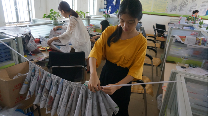 为了学生们废物可提高重复利用的环保意识,培养学生创新思维,心之源社会实践队决定在文艺汇演晚会上安排环保时装秀的节目。主要负责制作服装的是实践队队员李倩红和曾海霞。