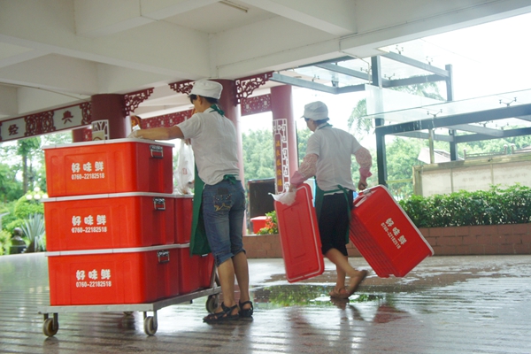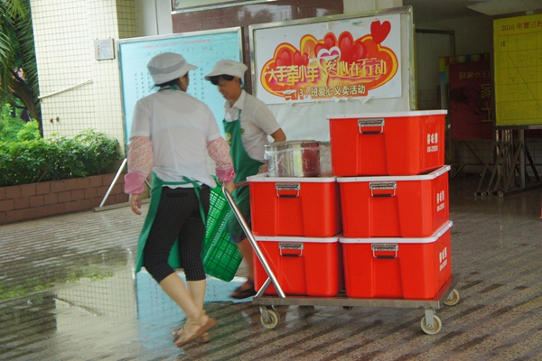 “孩子们开饭了,都过来吃饭吧!”远处传来阿姨熟悉的声音,“朝雨”社会实践队队员们都急匆匆地赶来大厅里集合,抬着厚重的饭箱,对阿姨热情地道谢。接着队员们把饭箱送到课室门口,将餐盘分发给教室里的每一位学生。其实,每一次听到阿姨喊我们吃饭的声音,都能触摸到她眼里的一抹温柔,口中的一份亲切。这温柔亲近的声音,总给人一种胃口大开的食欲。