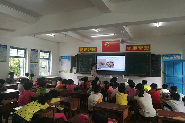 在本次的课堂中,崔倩钰老师通过问答环节引入课题并借此给学生讲述了食品安全的含义。在讲解过程中,老师通过生动有趣的ppt来给学生展示有关由食品安全引起中毒的案例,还给学生们就个人和社会两方面剖析了当前社会食品安全问题如此泛滥的原因。不仅如此,崔老师还通过有趣的动画来列举我们身边各种添加剂的类型与危害等例子,重点介绍了现在的十大垃圾食品。整个课堂中“枫聆”社会实践队的队员与学生们的互动频繁,学生在台下十分认真地听讲,课堂气氛十分融洽。在课堂接近尾声的时候,老师还通过有趣的动画视频来让学生知晓在由食物安全引起的突发事故的症状以及处理措施。