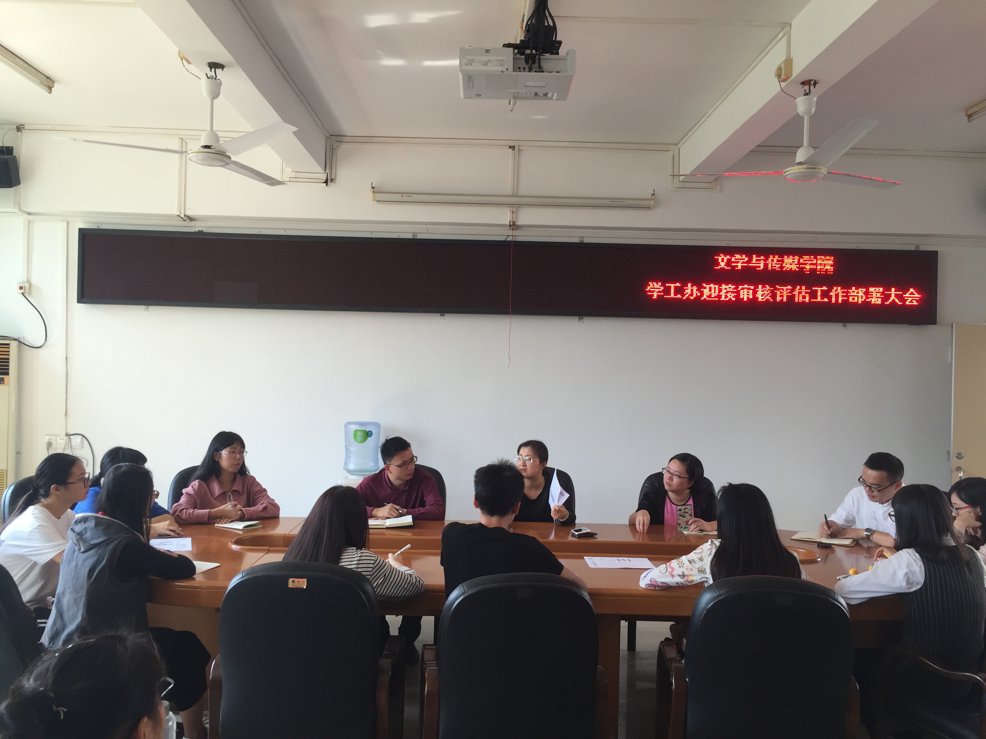 为迎接教育部本科教学审核评估,积极响应我校迎评工作部署安排。10月26日上午,文学与传媒学院学工办于第三教学楼四楼会议室召开了迎评部署大会,此次参与会议的人员主要有文传学院陈凯珍副书记、全体辅导员老师以及学生机构主要干部等,会议由陈凯珍副书记主持。