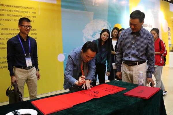 观展结束后,陈明教授对我院寄予了殷切期盼,并亲自为我院教师作品展题字:无字之歌。他解释道,音乐是有音符的,是有字之歌。而美术是由线条所呈现的旋律,是无字之歌。