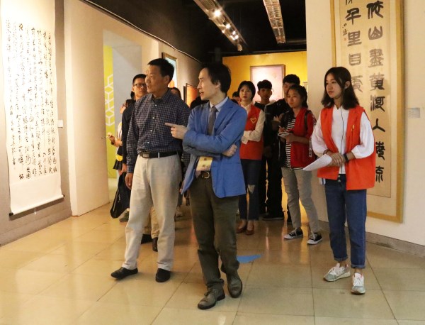 随后,陈明教授等人移步至书法作品区,解说员为其详细介绍了本院书法教学的悠久历史、师资力量和学科特色。在欣赏国画作品过程中时,陈明教授高度肯定了学生本科毕业创作作品。巨云和院长介绍道,学院现将毕业创作设计与创作报告融为一体,优化毕业考核机制,增进学生毕业创作与报告的关联性,此举有助于提升教学质量,增强学生考核工作实施力度。