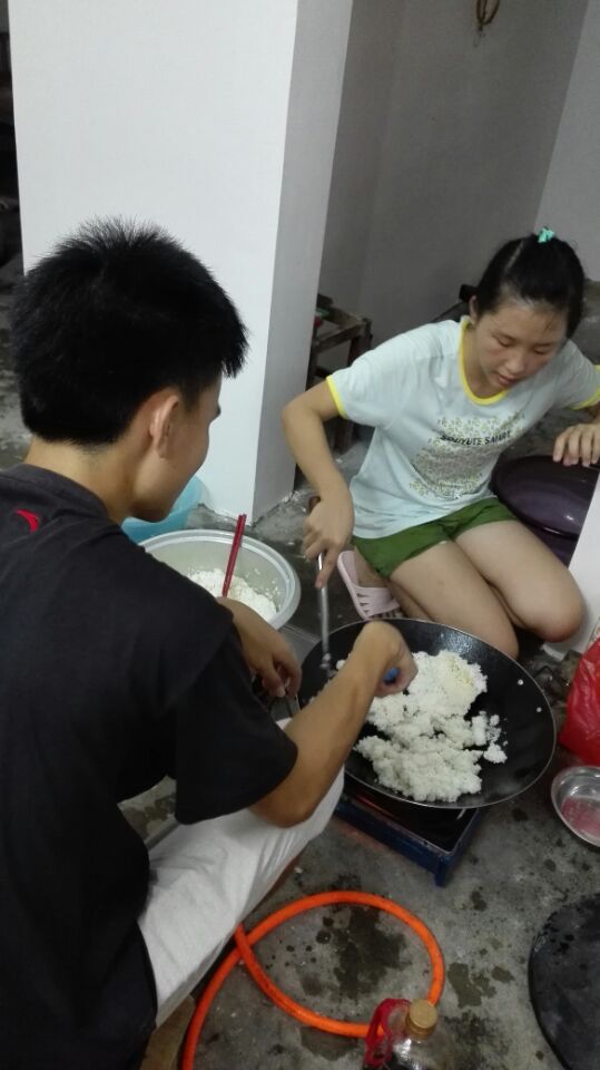 除了鸡汤以及冬菇鸡,我们还有两锅很稠的剩饭,别以为剩饭没用,在三下乡中,食物是不允许有一丁点浪费的。于是虽然也觉得不太合适,但是我们还是把这两锅剩饭做成了炒饭。在炒饭过程中,我们体会到了用稠饭做炒饭的痛苦。米饭一直黏在一块,即使你把它分开了,但是只要你在炒上那么几下,米饭又会重新黏成一块,小洁妈妈作为一个完美型的女人,当然是不希望让炒饭这样黏成一块咯,所以她把饭放在锅里煎了很久,然而事与愿违,米饭根本就没有一点要变干一些的迹象。事实证明小洁妈妈根本就是在做无用功。